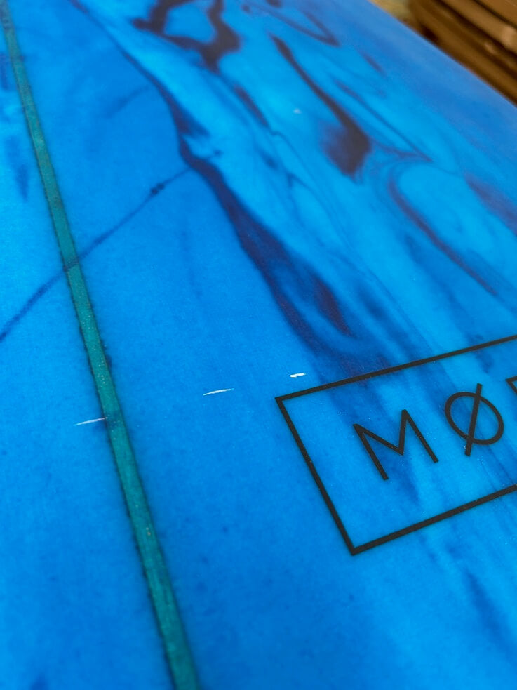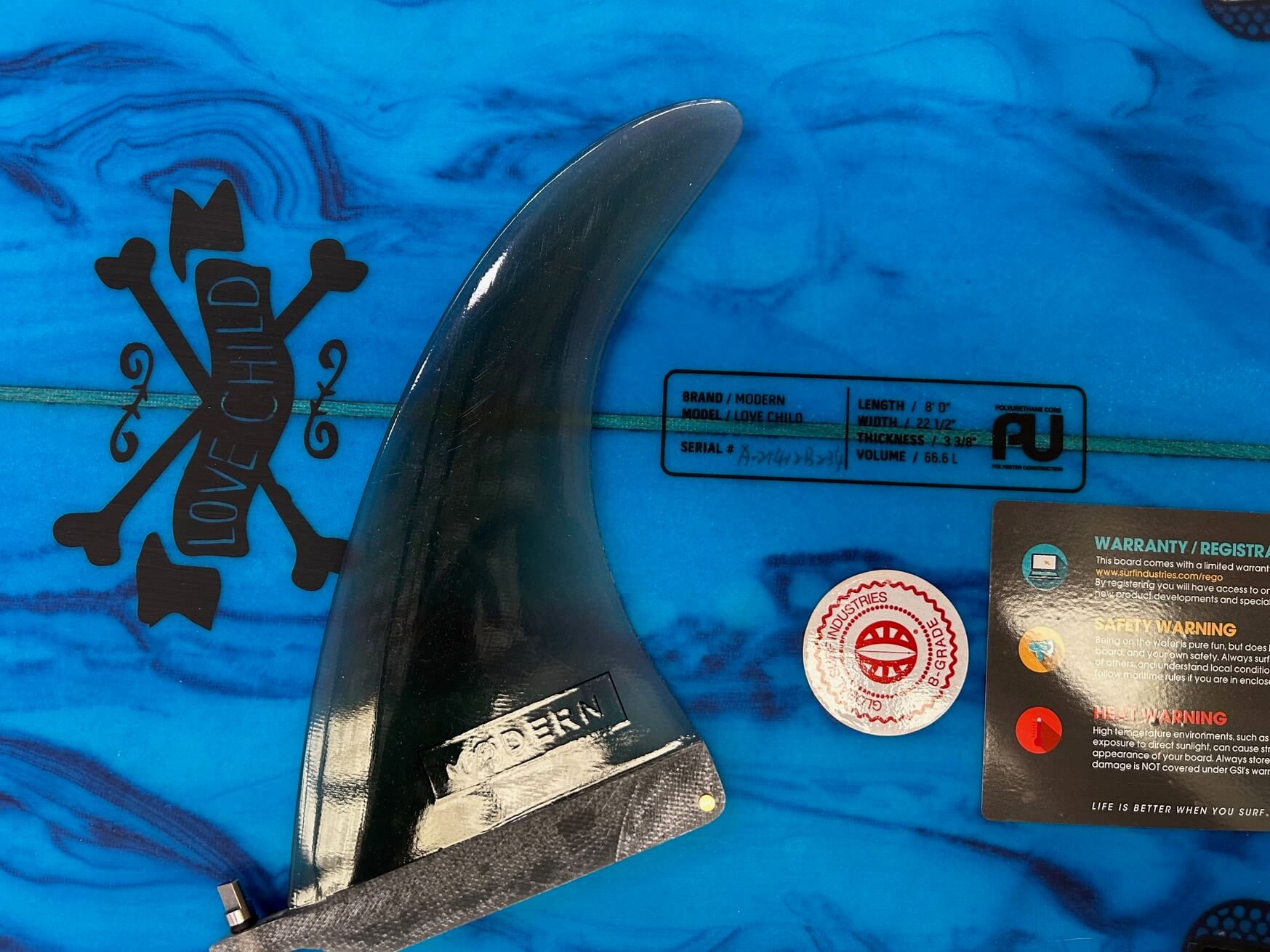 This Modern love Child Bluet int is brand new but has been marked as a B grade due to the marks in the resin tint on the rail. This is under the glassing and is just a cosmetic defect. There is also a tiny surface scratch on the bottom the will not effect the board. The Love Child is a versatile Mid length and a must for your Quiver.Â