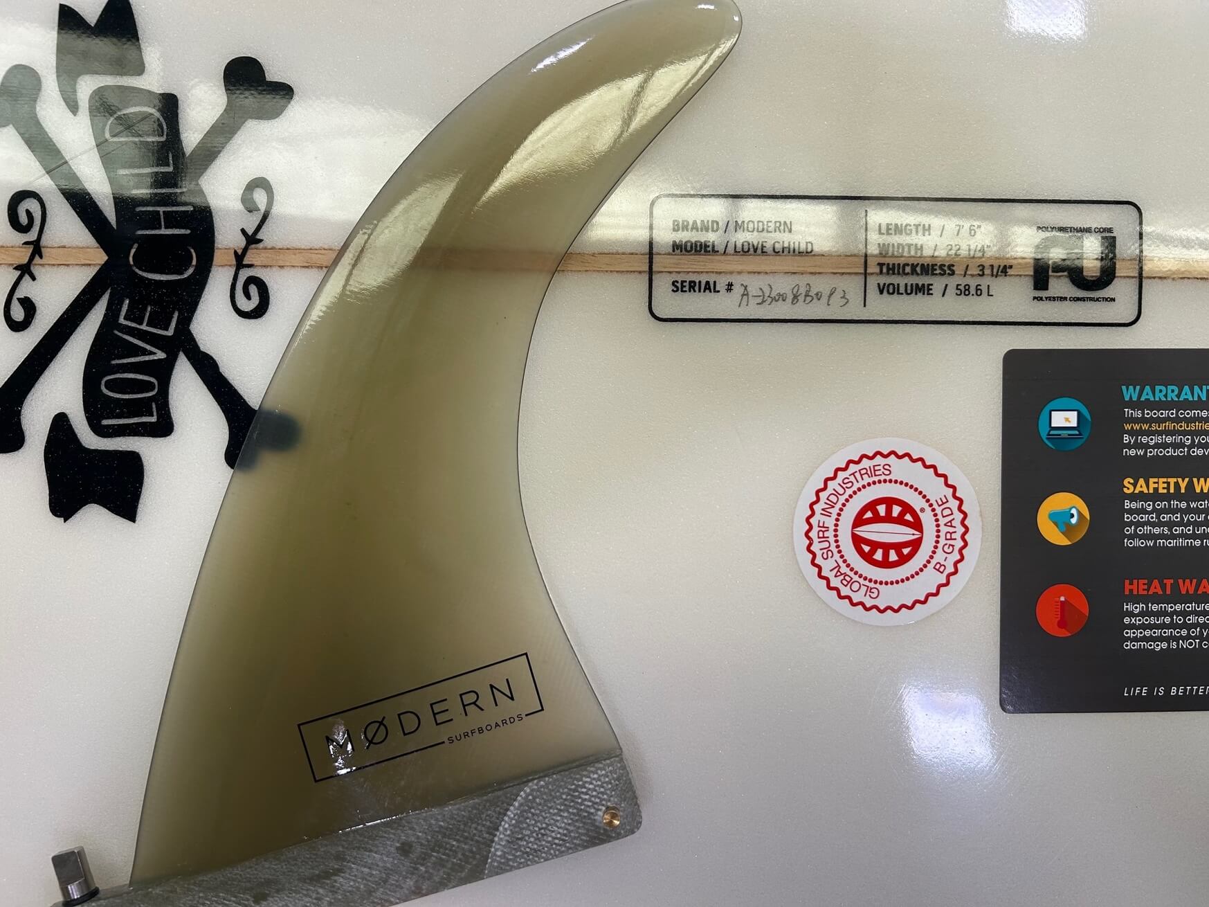 This Modern love Child is brand new but has been marked as a B grade due to two marks in the foam under the glassing on the deck. This is just a cosmetic imperfection and will not effect the board. Once waxed up you won't even notice the mark. 66 litres in this 8'0 mid length make it a wave catching machine.
