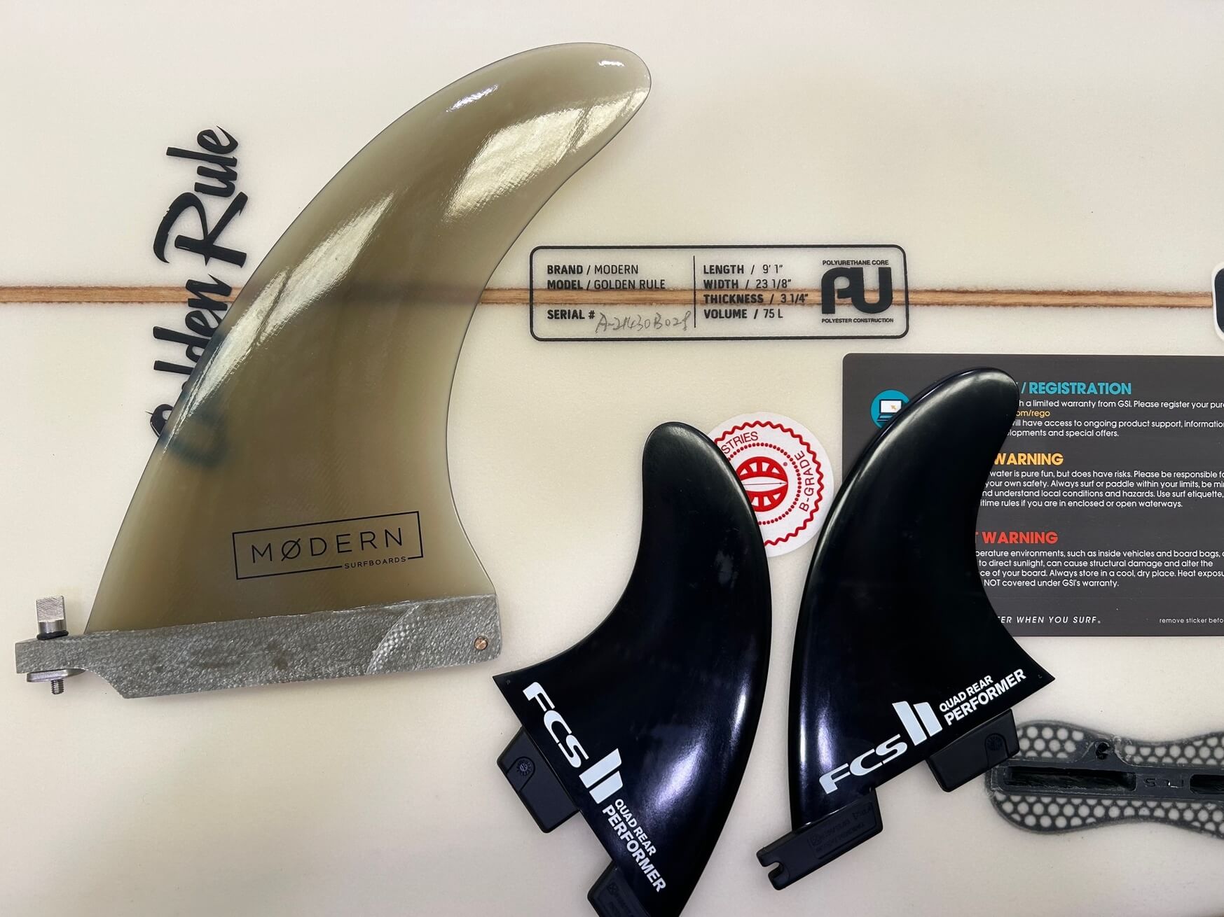 Modern Golden Rule Longboard 9'1 . This is an awesome cruiser for the small days, which allow you to truly rule the line up. This board is brand new. it has been marked as a B grade as the board has gone a little yellow and has some marks on the bottom under the glassing. This is just cosmetic and will not effect the board.