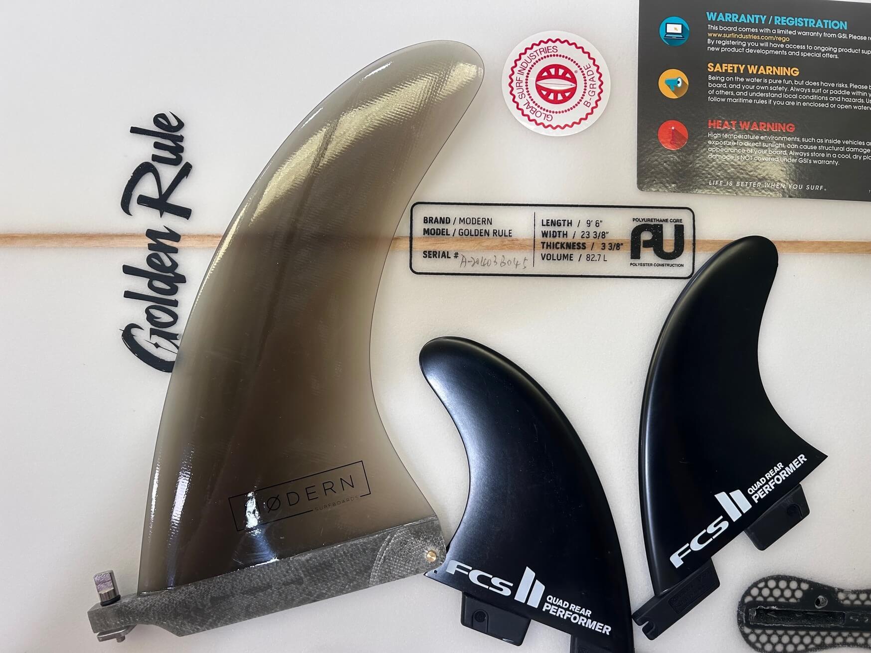 Modern Golden Rule Longboard 9'6 .Clear with pinlines is an awesome cruiser for the small days, which allow you to truly rule the line up. This board is brand new. it has been marked as a B grade as it has some marks in the blank under the glassing on the bottom. These are just cosmetic and will not effect the board.
