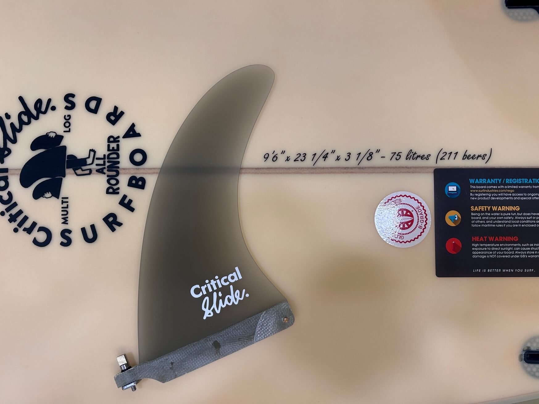 The board comes with a 8" single fin. 9'6 x 23'1/4 x 3 1/8" 75 Litres